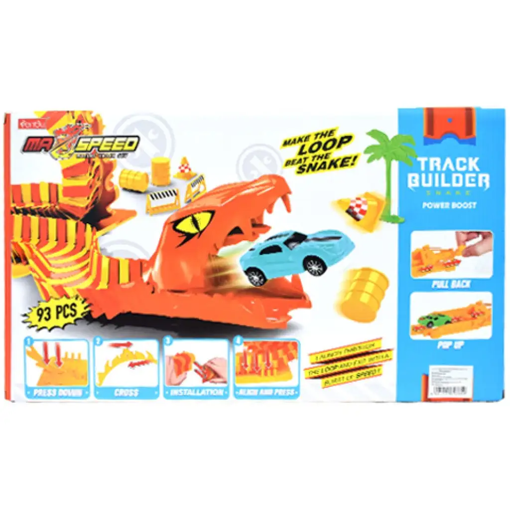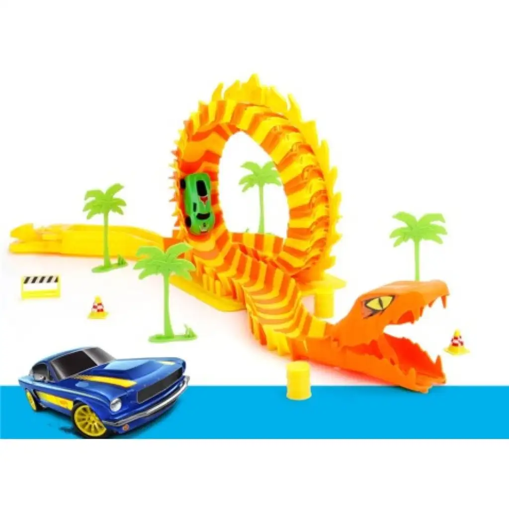 Ez a különleges autópálya pont úgy tekeredik, akár egy igazi kígyó, köszönhetően különleges kialakításának. A pálya egyik végén egy kilövő állomás található, amelynek a segítségével három különféle sebességgel lehet elindítani a kisautókat, így azok könnyedén át tudnak majd száguldani a hurkon, vígy bármilyen hajmeresztő kanyaron, amit csak a több tucatnyi összepattintható pályaelemből megalkotnak a kis srácok. A pálya másik végén egy félelmetes kígyófej várja a kocsikat, amin nem árt mielőbb végigszáguldani, ha nem szeretnénk, hogy az állkapcsok összezáruljanak, mielőtt még kiérünk. A csomagban a pálya mellett hat darab vagány kisautó is helyet kapott, így kibontás után azonnal kezdődhet is a játék.