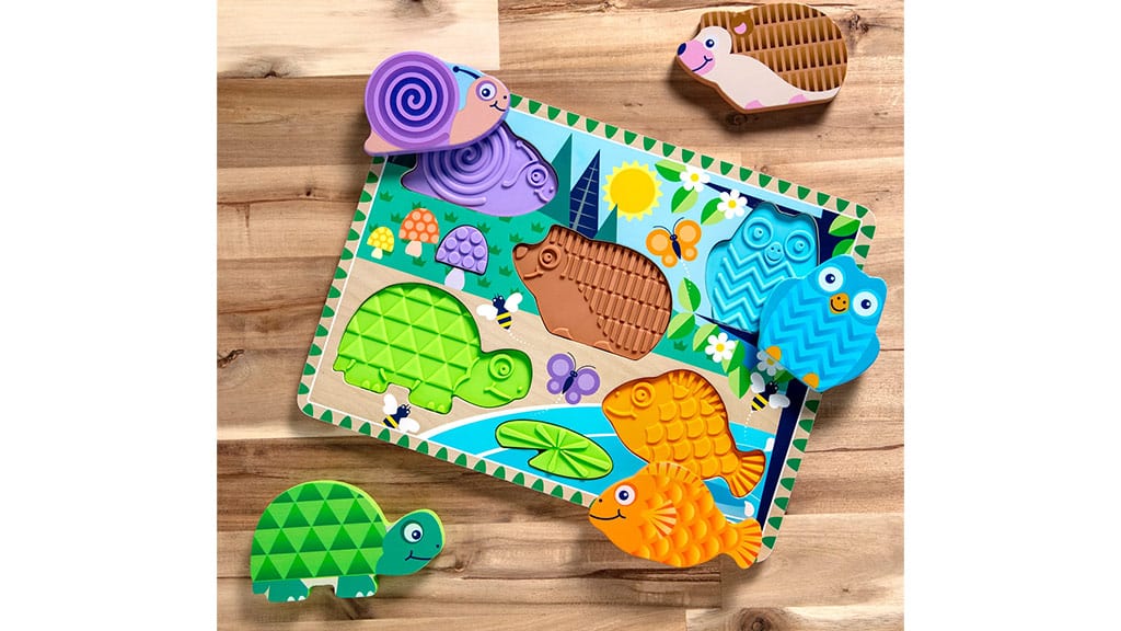 A Erdei barátok tapintásfejlesztő puzzle egy újabb 5 darabos kirakó készlet, amely bájos erdei állatokat mutat be: egy barna sünit, egy zöld teknőst, egy narancssárga halat, egy lila csigát és egy kék baglyot, akik mind egy tó körül gyűltek össze. A 2 éves és annál idősebb gyerekek a kirakó darabokat a táblán található puha, szilikon textúrákhoz illeszthetik, ezzel fejlesztve a problémamegoldó képességüket, miközben izgalmas, érzékszervi élményben is részük lehet. Ez a játék nemcsak szórakoztató, hanem segíti a finommotorika fejlődését, valamint támogatja a színek és formák felismerését is.