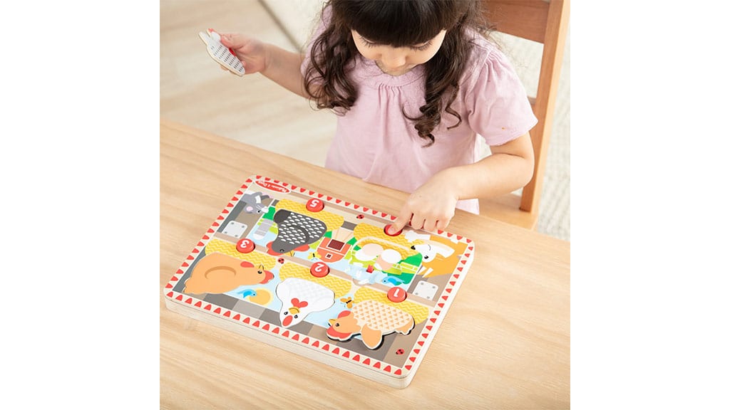 Ez a farm témájú kirakó egy fából készült táblát tartalmaz, amelyen 5 mágneses tyúkfigura és 5 számozott gomb található. A gyerekek minden gombot megnyomva kipattinthatják a tyúkokat a fészkükből, így előbukkannak a számokkal megegyező tojások. Ez a játék nemcsak szórakoztató, hanem segíti a számok felismerését, a finommotorikus készségek fejlődését és a logikus gondolkodást is. A minőségi faanyagból készült, tartós és biztonságos játék ideális választás óvodás korú gyermekek számára. A Melissa & Doug márka garantálja a kiváló minőséget és a kreatív játékélményt.