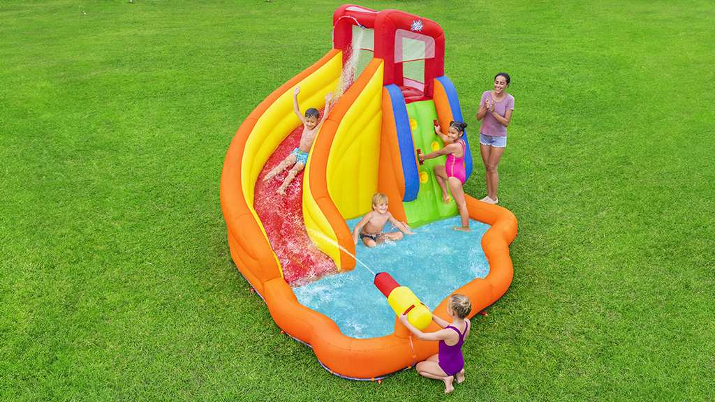 Ez a hátsó udvari vízi park egy mászófalat, egy óriás csúszdát, egy vízpermetezőt, egy medencét a csobbanáshoz és pihenéshez, valamint egy beépített vízi ágyút tartalmaz. 2 perc alatt felfújható.