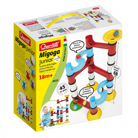 A Quercetti ez alkalommal a kisebbeknek is olyan komplex és szórakoztató golyópályát készített, amit a gyártó komolyabb darabjainál már megszoktunk. A ebben a csomagban egy 45 darabot számláló pálya várja, hogy összeállítsuk. Az elkészült pályán több mint 65 centi magasról indíthatjuk útjára a kifejezetten kicsik számára készített 4,5 cm átmérőjű golyókat. A Migoga golyópálya elemei nagyobb méretűek, az összeállításuk könnyű még a kicsik számára is, a nagyobb méretű golyók pedig csörgő hangot adnak, így téve még érdekesebbé a játékot a gyerekek részére.