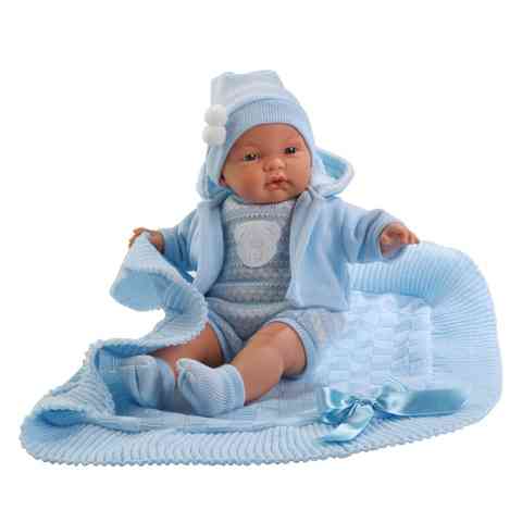 Egy kék álomban élheti meg a babázást az a gyermek, aki ezt a kisfiú babát magáénak tudhatja. A baba ruházata, a rugdalózó, a kapucnis kardigán, a pom-pommal díszített sapka és zokni, pont úgy, ahogy a takaró is, könnyen kezelhető hurkolt anyagból készült. A takaró báját fokozza a szatén szalagból készített masni. A baba teste textil, így ebben van elhelyezve a szerkezet, mely sírásra alkalmassá teszi a játék babát. A sírás úgy szüntethető meg, hogy a baba szájába kell tenni a cumit. Kiváló ajándék lehet ez a baba olyan kislányok számára, akik értékelik az igényes játékokat.