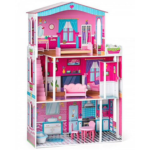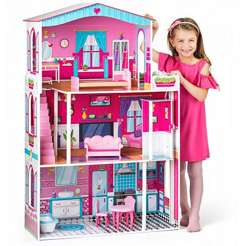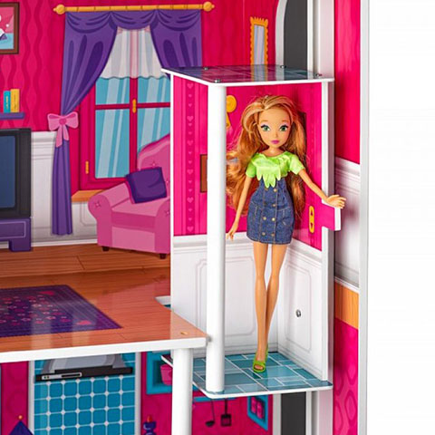 A Mirabella rózsaszín babaház remek választás a kislányoknak, akik egy részletgazdagon kidolgozott és berendezett babaházban szeretnének játszani. A babáknak három emelet áll rendelkezésére és a terasz sem hiányzik. A földszinten található a fürdőszoba és a konyha, az első emeleten nappali, legfelül pedig a hálószoba. A földszintről az első emeletre a babák felvonóval juthatnak fel, az első emeletről a másodikra pedig lépcsőn mehetnek fel. Bútorok is tartoznak hozzá, így azonnal neki lehet kezdeni a játékhoz. A Woodyland Mirabella babaház nyitott,ennek köszönhetően minden része könnyen megközelíthető. A babaház fából és kiváló minőségű farostlemezből, míg a bútorok fából, műanyagból és textilből készültek.