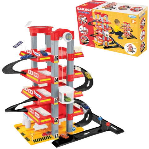 Egy hatalmas méretű parkolóházzal lepheted meg gyermeked amely összesen 5 különálló emelettel rendelkezik és a gerincén egy manuálisan működtethető lift is megtalálható. A parkolóház akár gyermeked már meglévő autópályáival is összecsatlakoztatható amely még magasabbá emeli a játékélményt. A szett 1db autót tartalmaz, a garázs kompatibilis bármely további kisautóval. A manuálisan működtethető lift üzembe helyezéséhez csupán az oldalán található kart kell tekerned és máris feljut a kisautó a parkolóház legfelső szintjére. Nagy méretének köszönhetően akár több autóval egyidejűleg is játszhat gyermeked akár egyénileg, akár barátaival közösen.