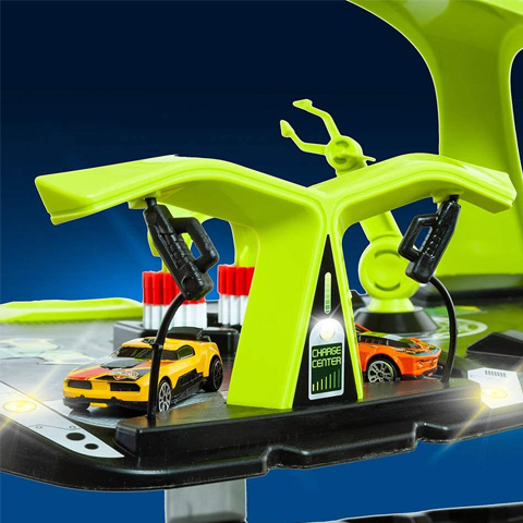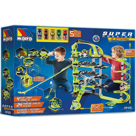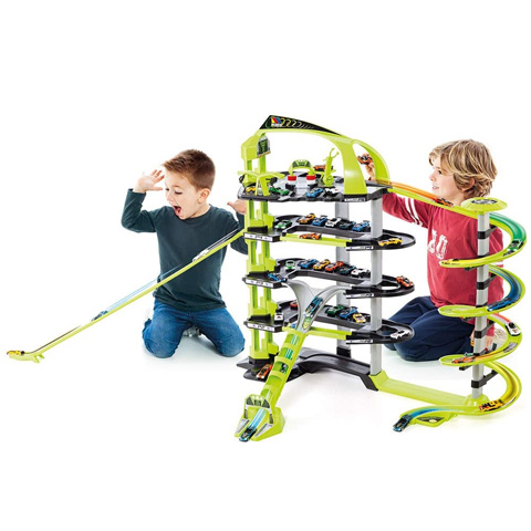 Hatalmas méretű, szuper funkciókkal ellátott garázzsal lehet még érdekesebb a játék a gyerekek számára, akik az 5 szint mindegyikére elhelyezhetik a gyűjteményükben található kisautójukat. Összesen 24 parkolóhelyre állhatnak be a kocsikkal, a legfelső emeleten pedig mosó is várja a járgányokat. Lift és spirál pálya egyaránt felvezet a szintekre, ahonnan hosszú egyenes úton száguldhatnak le aztán! A játékszett összesen 5db kisautót tartalmaz, melyekkel azonnal kezdődhet is a játék.
