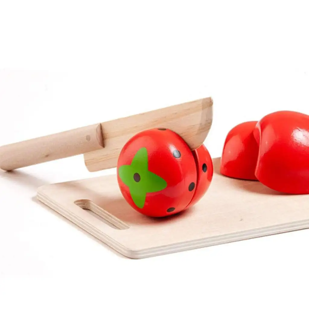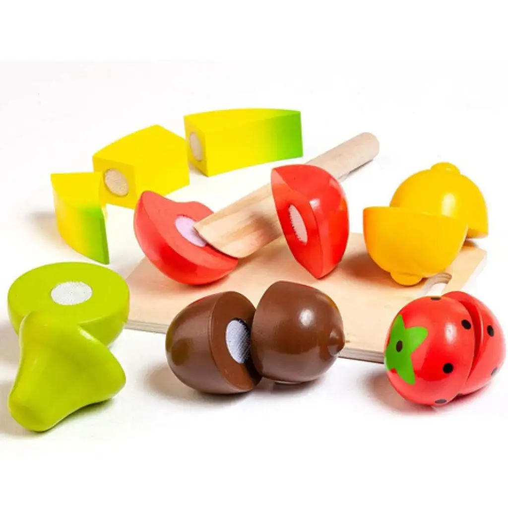Remek kiegészítője lehet a kicsik konyhai játékának ez a fa gyümölcsszett, hiszen összesen hat különböző gyümölcsöt is tartalmaz: alma, körte, banán, citrom, kivi és eper is megtalálható a szettben, melyek mindegyike különleges kialakítással készült. A gyümölcsök szeletei tépőzárral kapcsolódnak, így a gyerekek az szeletelés valódi érzését élvezhetik a játék során. A játékszett része a kés mellett a tálca és a vágódeszka is, így felszolgálhatják rajta a gyümölcsszeleteket.