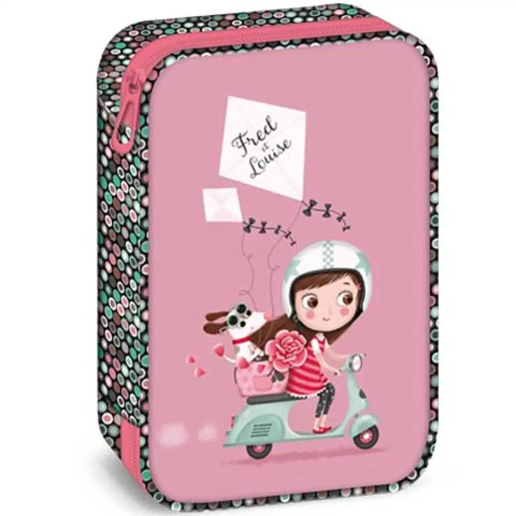 A Mon Amie többszintes tolltartó vidámságot fog csempészni a gyerekek mindennapjaiba. A rózsaszín árnyalat és az életteli, vidám grafika nyerő párosítás. Az alapszín már önmagában is mutatós, a tündéri Louise és kiskutyája, Fred illusztrációja pedig garantálja, hogy az iskolanapok széles mosollyal induljanak. A stílusos, egyben nagyon praktikus tolltartóban 30 darab ceruzatartót találsz, mely mellett radírnak, ceruzahegyezőnek, a rotring hegyeknek és még a vonalzónak is meg lesz a helye. Állítsd össze kislányod iskolai felszerelését a színes Mon Amie termékek segítségével, melyek széles választékát megtalálod webshopunkban szuper áron.