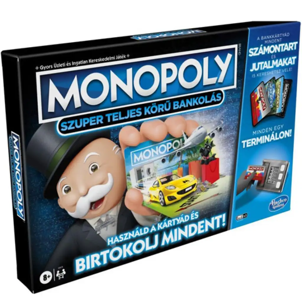 Ezentúl nem lesz szükség pénzre, elég csupán a bankkártyát használni az izgalmas és fordulatokkal teli játék során! A Monopoly Szuper teljes körű bankolás társasjátékban a játékosok a bankkártyán rögzíthetik minden pénzmozgásukat és még bónuszokat is gyűjthetnek! A játék célja változatlan; a tulajdonok megszerzésével minél több pénzt kell összegyűjteniük a játékosoknak, és a legvagyonosabb végül megnyeri a játékot!