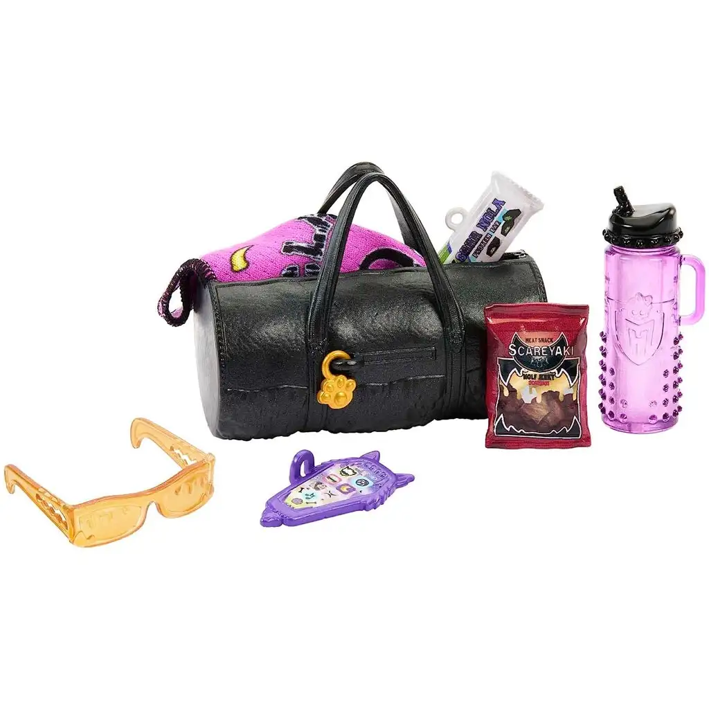 A baba kiegészítői között szerepel egy fekete sporttáska, ami praktikus és divatos, ideális a Monster High diákjainak számára az iskolai napokhoz vagy éppen sportos tevékenységekhez. A kulacs segítségével Clawd mindig frissítő italokkal töltheti fel magát, amikor szüksége van rá. A napszemüveg védelmet nyújt a fényes napsütésben, míg a telefon segítségével kapcsolatban maradhat barátaival és családjával.