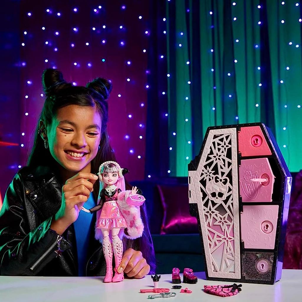 Ez a különleges baba egy koporsó alakú dobozban érkezik, ami önmagában is lenyűgöző és izgalmas. A koporsó rejtett titkokkal teli rekeszeket tartalmaz, amelyekben több mint 19 meglepetés kiegészítő található. A szekrények kulccsal nyithatók, a kulcsok pedig rejtélyes titkokat őriznek, mivel igazi formájukat csak melegvíz hatására mutatják meg, így minden új lépés egy újabb izgalmas felfedezés lehet, amikor lelepleződnek a borzalmasan jó kiegészítők, így a gyerekek izgalmakkal teli pillanatokat élhetnek át, amikor kinyitják és felfedezik a rejtett kincseket.