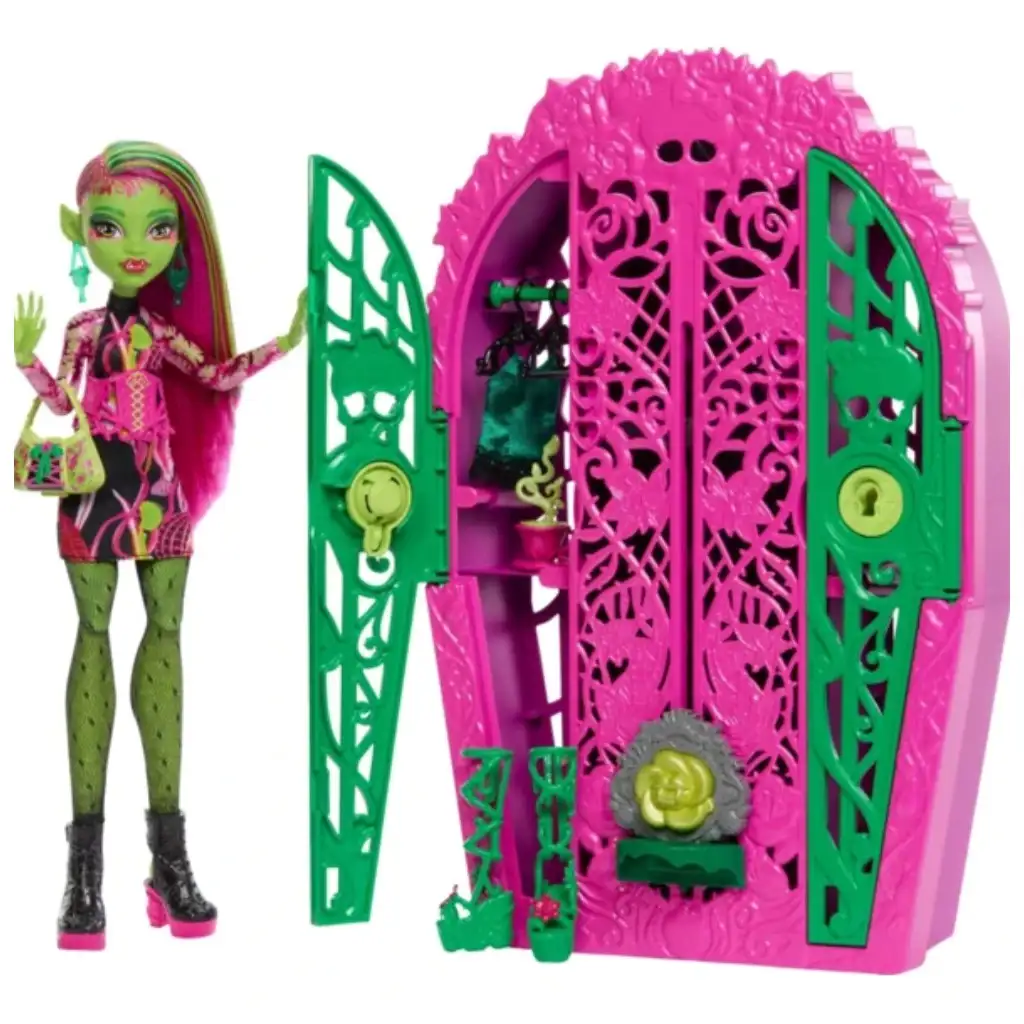 Lépj be a Monster High varázslatos világába a Rémes nyomozás kertitkok Venus McFlytrap babával! Ez az egyedi játék szett egy élénk rózsaszín és zöld szekrényt rejt, amely tele van meglepetésekkel. Venus, a természetet imádó, vagány szörnylány, számos különleges ruhát és kiegészítőt rejtett el, amik tökéletesek a kreatív játékhoz. A 22 darabos készletben rejtett rekeszeket fedezhetsz fel, amelyek több mint 125 stílusvariációt kínálnak – így mindig új megjelenést alkothatsz.