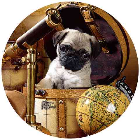 A kutyafajták közül a Mopszok, nem az okos tekintetükről híresek, de nem is ezért kedveljük őket. Amúgy kedves teremtések, és jókat lehet rajtuk nevetgélni. Ez a kutyus ki tudja miért keveredett egy dobozba, de a kép kirakása hosszú időre lekötheti a figyelmünket. A kép nem hagyományos téglalap formájú, hanem kerek, így dobva fel még jobban a képet. Az elkészült kép végül egy szép dísze lehet a szobánk falának. Kirakását ugyanúgy kell kezdeni, mint a hagyományosnak, először a kép széleit kell kirakni, majd onnan befelé kell haladni.
