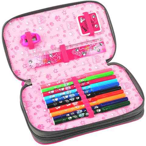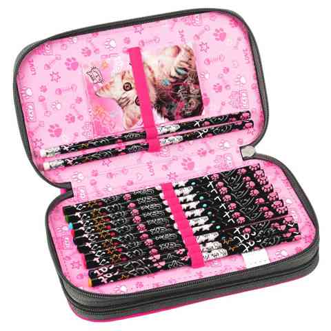 Kifejezetten kislányok számára készült ez a mutatós mintával készített emeletes tolltartó, melyen kedvenc háziállatod, egy bájos cica szerepel. A két emeletre osztott tolltartó cipzárral záródik, belsejében gumis rögzítések lettek kialakítva az írószerek összekeveredésének megelőzése érdekében. A tolltartót a táskádba helyezve máris készen állsz az iskolára, hiszen az minden írószert tartalmaz!