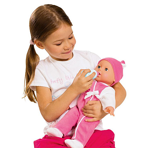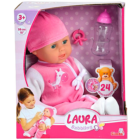 Összesen 24 különböző babákra jellemző hanghatást hallgathatsz meg Laura babádtól játék közben, ami így csodás játékélményt garantál a gyerekeknek. A puha baba feje és végtagjai gumiból készültek, míg teste textilből. A cumisüveg és cumi kiegészítőkkel a kislányok szerepjátékba kezdhetnek, így megtapasztalhatják a gondoskodás érzését. A baba vízszintes helyzetben lecsukja a szemeit.