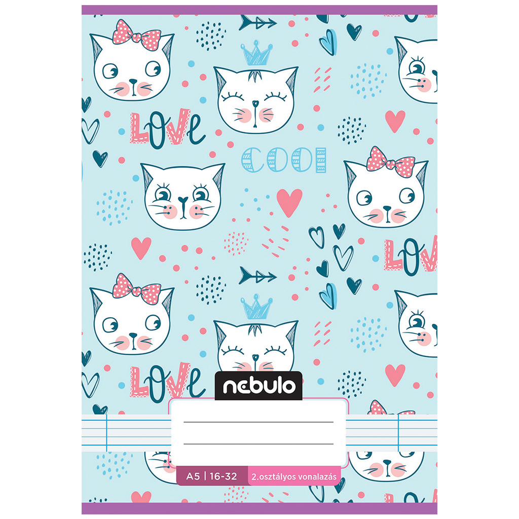 Ez a Nebulo pasztell kék alapon cica mintás tűzött füzet garantáltan mosolyt csal minden másodikos gyerek arcára, különösen a cicabarátokéra. A játékos mintázat, aranyos cicarajzokkal, szívecskékkel és vidám feliratokkal (pl. "LOVE", "COOL") igazán kedves hangulatot teremt, így a gyerekek szívesebben veszik elő, még akkor is, ha a tanulásról van szó.