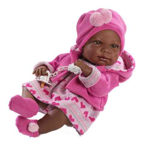 Ennek a bájos néger babának az öltözéke csodás, álomszép. Színvilága a rózsaszínre épül, melynek számos színárnyalata megtalálható a ruházatban. A pom-pom díszítés ismétlődik a sapkán és a zoknin is, ami kimondottan bájossá teszi a látványt. A ruhának a mintázatán szívecskék láthatók, melyek feldobják a pasztell rózsaszín alapot. Ugyan ez a minta tükröződik vissza a kabátka kapucnijának bélésén is. A játékbaba karjai és lába, feje két irányban mozdíthatók.