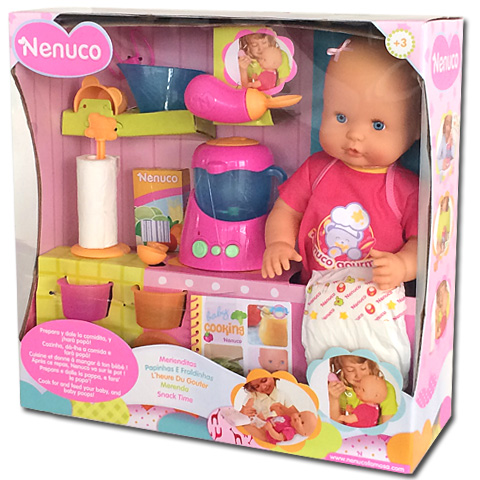 Készítsd el a finom ételt és etesd meg kisbabádat a játék során! A különleges Nenuco babád kezd éhes lenni, így nekiláthatsz az ennivaló elkészítésének. A kis receptkönyvből ötleteket meríthetsz az étel elkészítéséhez., amihez a turmixgépet is használhatod. Elkeverés után máris kanállal adagolhatod a babának, aki elfogyasztja azt. Evés után nem ért ellenőrizni a pelenkát is, hiszen Nenuco babád kakilni is képes! A kiegészítőket használva remek játékélményben lesz részük a kislányoknak, akik az etetéshez szükséges minden kiegészítőt megtalálnak a dobozban!