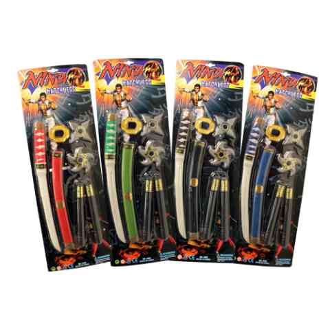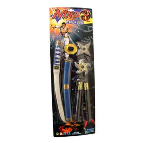 Ninja jelmezedhez elengedhetetlen kellék lesz ez a fantasztikus Ninja fegyver szett, melyet 4-féle színváltozatban is választhatsz! A készlet tartalmaz egy katanát tokkal, egy ninjakut és kétféle dobócsillagot, melyeket mind az övedre tehetsz. Ezekkel a remek felszerelésekkel garantáltan Te leszel a legmenőbb nindzsa a jelmezbálon, de akár otthoni játékra is tökéletesen alkalmas a szett.