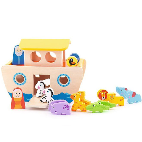 Noé felkészült az özönvízre a kisgyerekek pedig remek játék keretében ismerkedhetnek meg a különféle állatokkal és közben számos készségüket fejleszthetik. A Noé bárkája fa játék természetesen első sorban egy huszonöt centiméteres hajót tartalmaz és persze Noét valamit az állatokat. A játék lehetőséget kínál, hogy a gyerekek párokba rendezzék az állatokat, majd a megfelelő formájú nyíláson keresztül a hajóba tegye őket. A játék fejleszti a kicsit figyelmét, a hasonlóságok és a formák felismerését és persze a finom-motorikus készségeket.