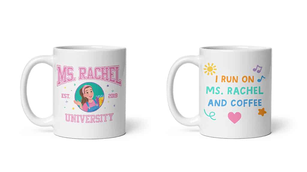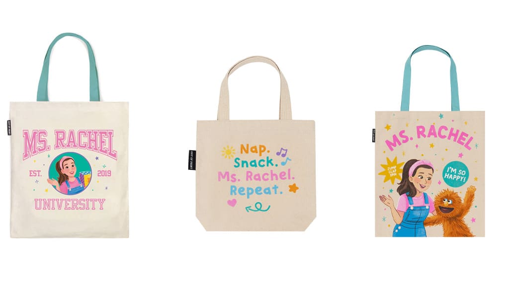 Ha a családod együtt nézi Ms. Rachel-t, akkor együtt frissíthetitek a ruhatáratokat is! Az Out of Print Ms. Rachel kollekciója tartalmaz pólókat, babaruhákat, táskákat, kávésbögréket és még sok mást, mindenki számára, aki igazán boldog!