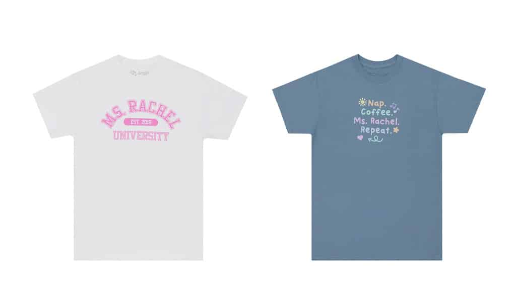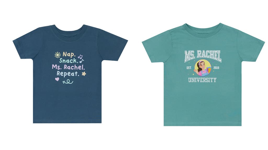 A családok összeöltözhetnek olyan pólókban, amelyeken az áll: Ms. Rachel Egyetem, Alvás. Nasi. Ms. Rachel. Ismétlés, és még sok más. A kollekcióban Ms. Rachel és Herbie képei is megtalálhatók.