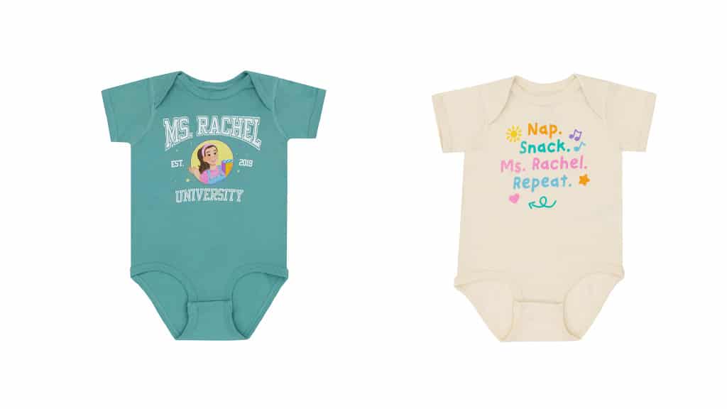 Két baba body és három gyerek póló áll rendelkezésre a kicsid számára. Ezek a ruhadarabok 100% pamutból készültek, és egy animált Ms. Rachel képeit tartalmazzák (ahogy az új képeskönyvében is látható). A ruhákon olyan kifejezések szerepelnek, mint Én egy nagyszerű gyerek vagyok, Alvás. Nasi. Ms. Rachel. Ismétlés, és „Ms. Rachel Egyetem. A pólók és bodyk színes ikonokkal vannak díszítve, mint például csillagok, zenei jegyzetek, pöttyök és még sok más!