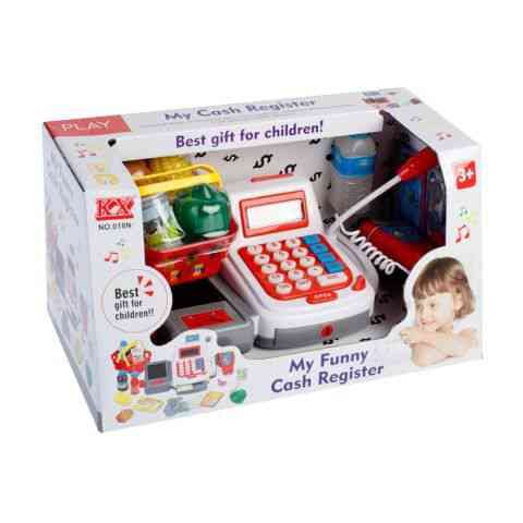 Pénztárgép játékszett szalaggal és termékekkelPénztárgép játékszett szalaggal és termékekkel