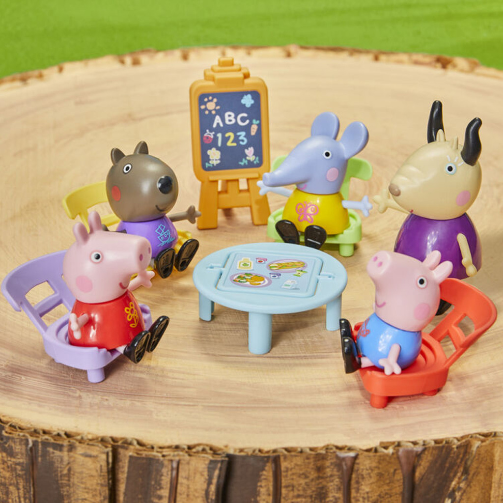 Tartalmazza: Peppa, 4 társ, 1 tanár figura, székek, asztal, tábla