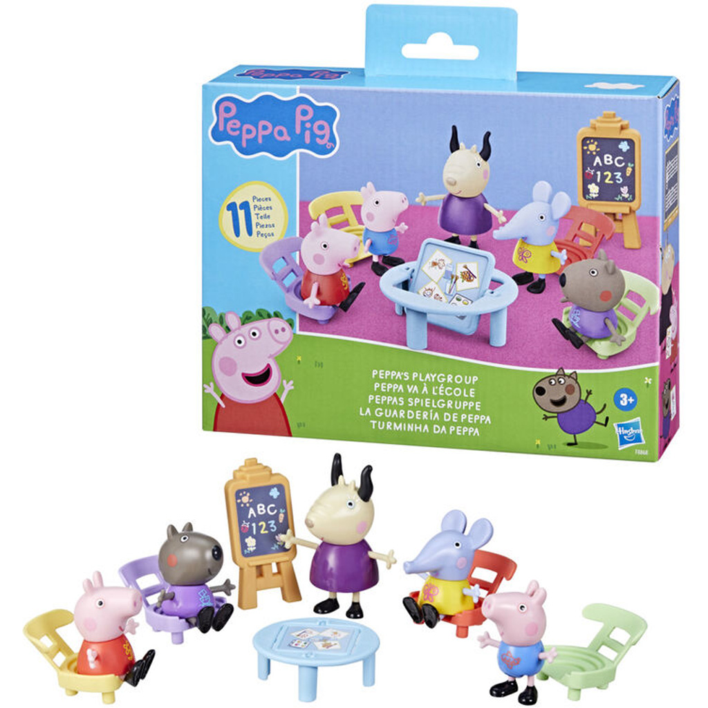 Indulhat az óvodai móka Peppa malaccal és barátaival! A Hasbro színes és vidám játékszettje a legkisebbeknek készült, hogy otthon is eljátszhassák a Peppa Pig mesék jól ismert jeleneteit – ezúttal az óvodai csoportban. A 11 részes játékkészlet tartalmazza Peppa-t, négy másik szereplőt, egy tanítót, valamint iskolai kiegészítőket: asztalt, székeket és egy táblát, így minden adott egy szuper szerepjátékhoz.