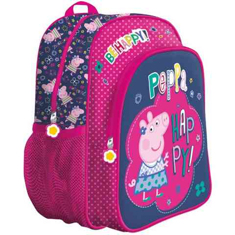 Fogadd meg Peppa malac tanácsát és légy boldog és ehhez ez a vidám színű és mintázatú hátizsák még az oviban is a segítségedre lesz A malacos mesefilm stílusa jellemzi a terméket, a két rekeszes ovis hátizsák oldalsó részén, és még a cipzárak húzókáján is megjelenik a virág mintázata. A kicsi kényelméről a párnázott hátkiképzés, és az állítható vállpántok gondoskodnak, melyeken a fényvisszaverő elemek óvják biztonságát közlekedés közben.
