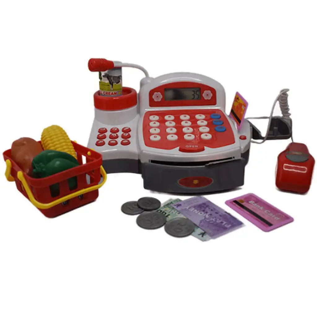 Piros funkciós elektromos pénztárgép játékpénzzel, termékekkel és hanggal