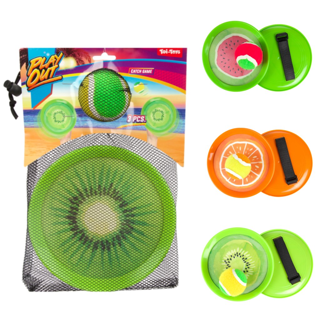 Szórakoztató és aktív játék a szabadban! A Play Out gyümölcs mintás ügyességi elkapójáték segítségével a gyerekek játszva fejleszthetik reflexeiket és mozgáskoordinációjukat. A készlet két, tépőzárral ellátott korongot és egy labdát tartalmaz, amelyet a játékosok egymásnak dobálnak és próbálnak elkapni. A színes, gyümölcs minták (narancs, kiwi, görögdinnye) vidám hangulatot csempésznek a játékba. Tökéletes választás kertbe, strandra vagy parkba. Az ár egy szettre vonatkozik, mely véletlenszerű mintával kerül kiválasztásra.