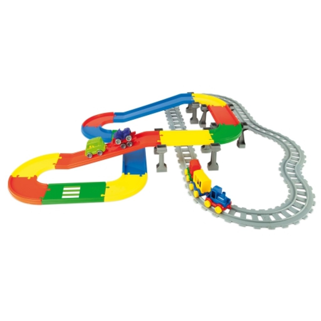 Ez a vasúti - és autópálya remek választás a három éves gyerekek, hiszen élénk színeivel, és az aranyos járgányaival egészen biztos, hogy könnyedén felkelti a kicsik érdeklődését. A pálya teljes hossza több mint hat méter hosszú és nagyon masszív és kiváló minőségű műanyagból készült. A vasúti vonal izgalmas kanyarokkal, míg a színes autóút egy felüljáróval teszi izgalmassá a gyerekek számára a játékot. A csomag természetesen a járműveket is tartalmazza, így az összeállítás után azonnal neki lehet kezdeni a játéknak.