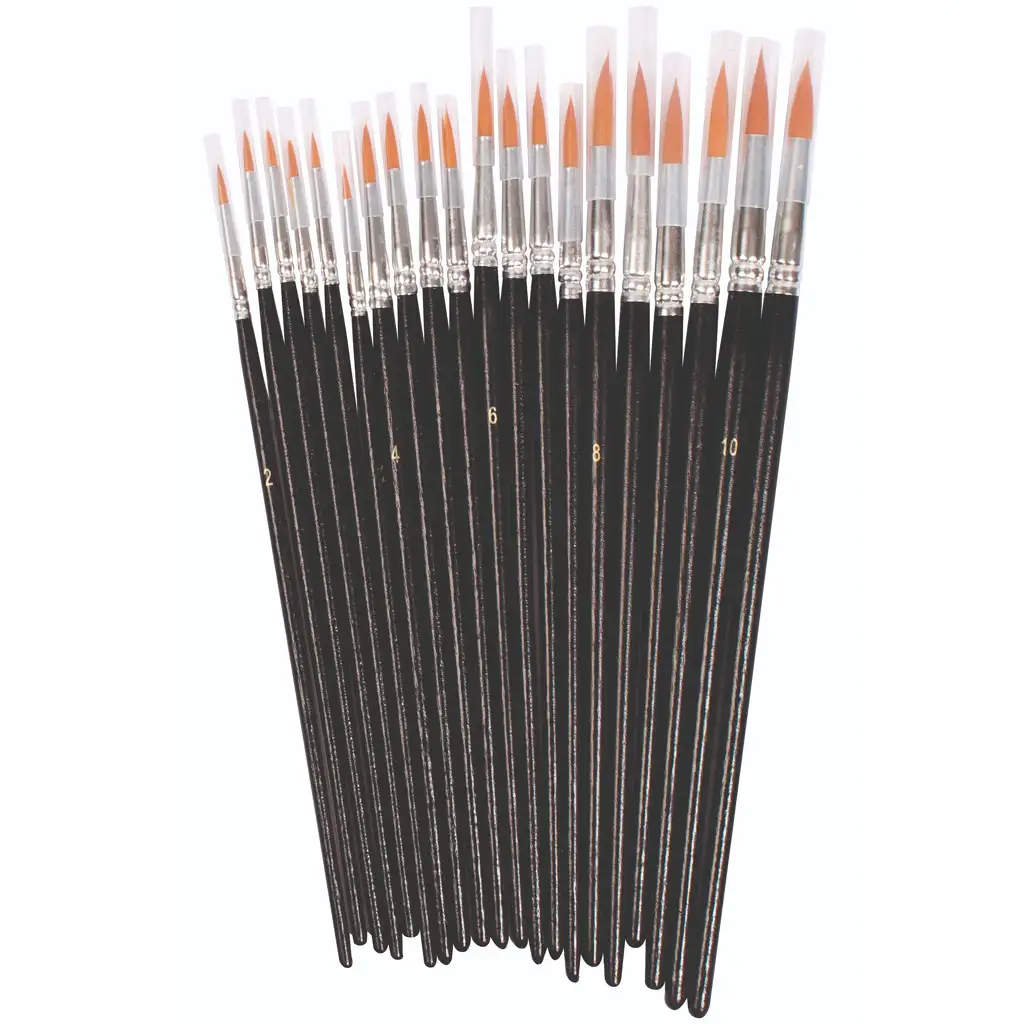 Ez a 20 darabos ecsetkészlet kiváló minőségű szintetikus anyagból készült, és tökéletes választás lehet akril- és olajfestékekhez. A kerek ecsetfejek laposak és lakkozott fa nyéllel rendelkeznek, ami kényelmes fogást és könnyű kezelhetőséget biztosít.