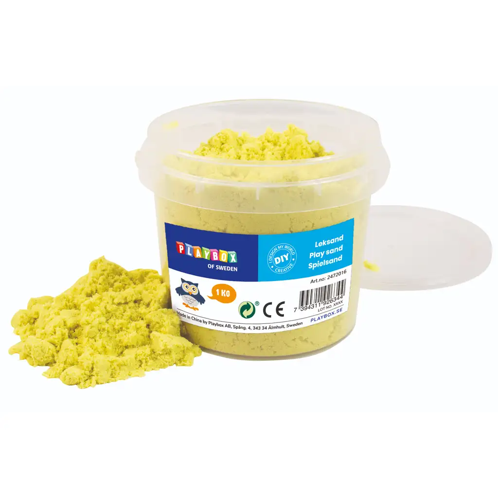 A PlayBox Sárga Színű Homokgyurma vödörben 1 kg tökéletes választás mindenféle kreatív alkotáshoz és kézműves tevékenységhez. Ez a homokgyurma élénk sárga színben érkezik, amely vidám és élénk megjelenést kölcsönöz az alkotásoknak.