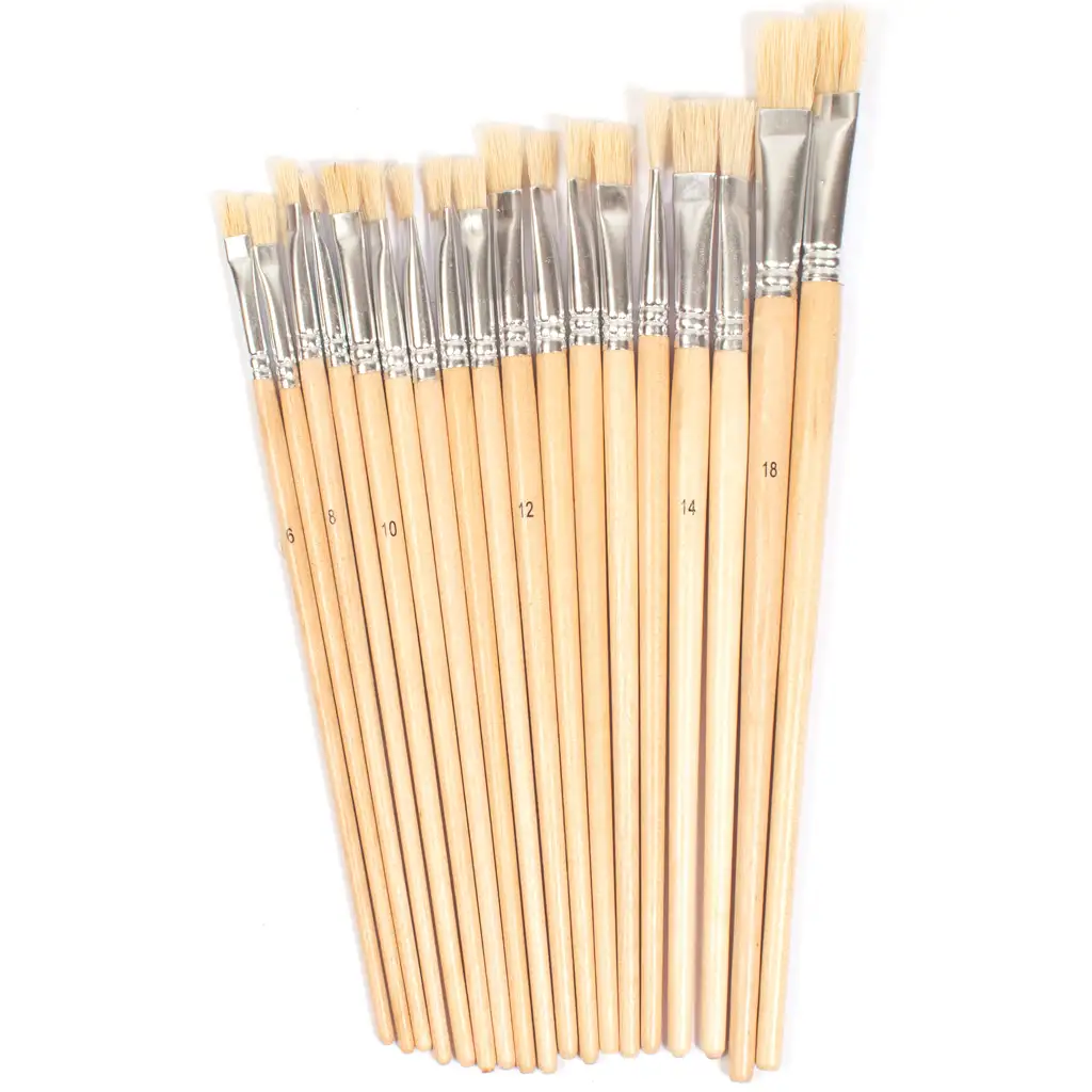 A készlet tartalmazza a 18 db lapos ecsetet, melyek mindegyike fa nyéllel rendelkezik, biztosítva a kényelmes fogást és irányítást.