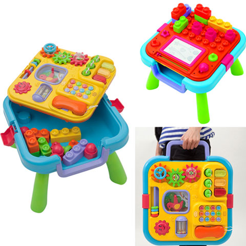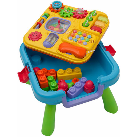 A kétoldalú bébi játékasztal praktikus és szórakoztató egyben. A játékasztal egyik oldalán egy hanghatásokkal gazdagított telefont, zenélő békákat, forgatós és tologatós játékokat találnak a babák, míg a másik oldalon színes építőkockákkal és rajztáblával fejleszthetik készségeiket. A játék további előnye, hogy felnyitva a kicsik bele pakolhatják az építőkockákat és kisebb játékaikat is.
