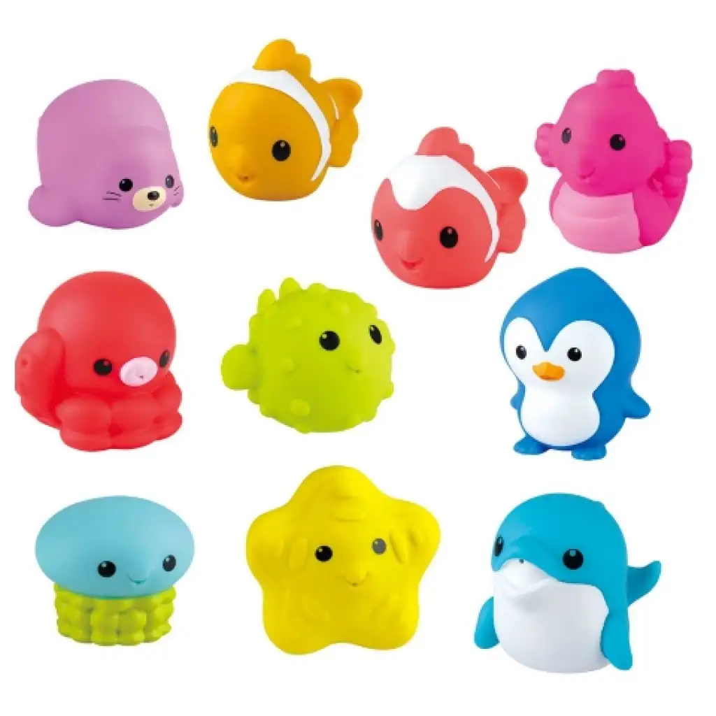 Ezek a cuki bébi fürdőállatok hatalmas mókát csinálnak majd a fürdetésből. A vidám kisállatok mindegyike spriccel, ha megtöltjük őket vízzel. A szettben összesen 10 db, színpompás vizi állatka található, így a gyerekek találkozhatnak pingvinnel, polippal, medúzával, 2db bohóchallal, delfinnel, fókával, tengeri csillaggal, csikóhallal és gömbhallal is. A szett egy praktikus, henger alakú tárolódobozban érkezik.