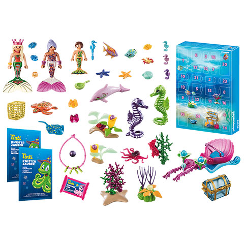 Ez az adventi naptár a sellők fantasztikus birodalmába viszi a gyerekeket. Egy sellő és fia értékes gyöngyszemek keresgél. A tengeri királynő feljön a tengeri lovaskocsin, és felajánlja, hogy mindkettőjüknek segítséget nyújt. Ki mondhatna nemet erre a királyi ajánlatra? Együtt találnak egy gyönyörű, kék, csillogó gyöngyöt, amelyet a hálójukba raknak. Ez a kirándulás valóban megéri. A játékkészlet tartalmaz egy adventi naptárat, 24 meglepetéssel, két sellőlányt és egy sellőfit, tengeri lovaskocsival, két nagyméretű tengeri csikóval, delfinnel, tengeri teknőssel, rúddal, polippal, tengeri csillaggal, hálókkal, kincsesládával, korallokkal és sok más remek kiegészítővel a nagy tengeri szórakozáshoz. Remek fürdőtermékek: A tinti fürdősó szórakoztató fürdést biztosít. A Playmobil figurák és kiegészítők kompatibilisek egymással így a gyerekek szabadon variálhatják őket, hogy egy igazi, színes és változatos világot alkossanak meg általuk, amelyekben a legkülönösebb történeteket is el lehet játszani.