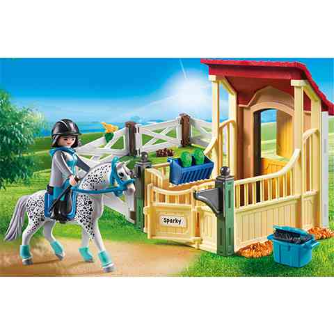 Ez a nagyszerű csomag egy lovas karámot tartalmaz, amelynek az ajtaja zárható, és akár a kifutó karámba lehet nyitni, hogy a szép appaloosa ló az ajtónyitás után szabadon vágtathasson néhány kört. A lovas ruhájának és a ló kiegészítői remek összhangban vannak, akárcsak egy igazi lovas bemutatókon. A Playmobil figurák és kiegészítők kompatibilisek egymással így a gyerekek szabadon variálhatják őket, hogy egy igazi, színes és változatos világot alkossanak meg általuk, amelyekben a legkülönösebb történeteket is el lehet játszani.