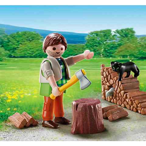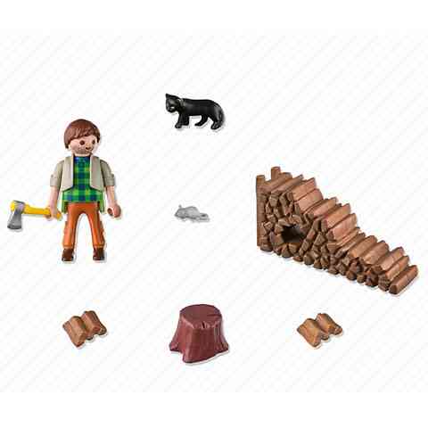 - a készlet tartalmaz 1 Playmobil favágó figurát, egy macskát, egy kisegeret, és a farönköket