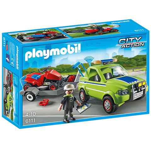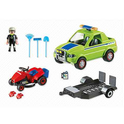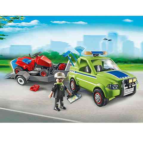 Playmobil világban is vannak olyan parkok és füves területek ahová nem elég a kézi fűnyíró, hiszen nagyon sokáig tartana levágni a füvet ilyen hatalmas területen. Amint megkaptad a telefonhívást pattanj be Playmobil figuráddal zöld színű terepjáródba és a trailer segítségével vontasd a helyszínre profi fűnyíró traktorod, hogy minél hamarabb elkezdhesd a munkálatokat.Miután a munkaterületre érkeztél és sikeresen leparkoltál az utánfutóról, ülj be figuráddal a traktorba és kezdődhet a fűnyírás!