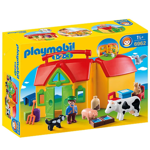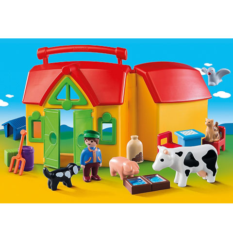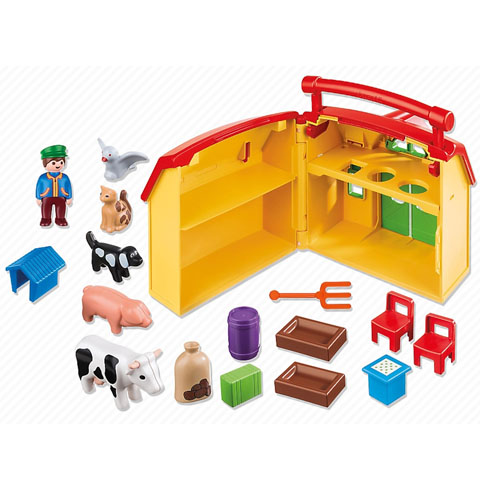 Egy szuper hordozható tanyával igazán nagy élmény játszani, hiszen csak szét kell nyitnod a bőrönd alku dobozt, és mindent megtalálsz benne ami a tanyavilághoz köthető. Háziállatok a tehéntől a macskáig és persze egy csomó apróság ami a ház berendezéséhez szükséges. A felső szinten egy formafelismerő játékot is találsz, amin keresztül áttolhatod a hordót, a zsákot és a ládát. A Playmobil 1-2-3 szettek kifejezetten a kicsi, másfél éves korú gyerekek számára lettek kitalálva, így az alkotóelemek és kiegészítők nagyobbak, hogy a kicsiknek kényelmes fogás essen rajtuk, és véletlenül se tudják lenyelni az egyes darabokat.