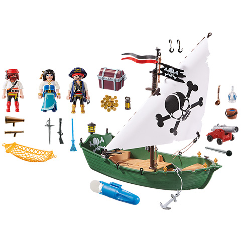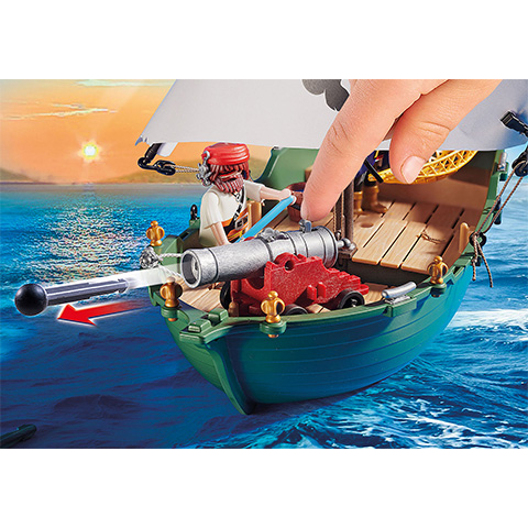 Egy kalózhajó önmagában is megannyi érdekes kaland forrása lehet, azonban ez a hajó még különlegesebb, hiszen egy víz alatti motor is jár hozzá, amit a hajó aljára erősítve és bekapcsolva elérhetjük, hogy a hajó valóban szelje a hullámokat. természetesen egy ilyen vagány hajóhoz személyzet is jár, és egy ágyú, amivel rettegésben lehet tartani a kereskedőhajókat. A Playmobil figurák és kiegészítők kompatibilisek egymással így a gyerekek szabadon variálhatják őket, hogy egy igazi, színes és változatos világot alkossanak meg általuk, amelyekben a legkülönösebb történeteket is el lehet játszani.