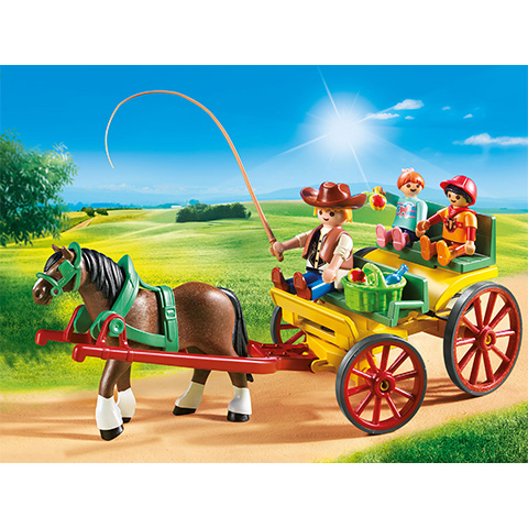A gyerekek imádják a lovakat, és biztosak lehetünk abban, hogy ezzel a lovaskocsival jól el fognak szórakozni a kicsik. A lovaskocsi elé egy igás lovat lehet befogni, míg a bakra az ostort csattogtató kocsist lehet ültetni, hátul pedig a gyerekeknek van hely. A Playmobil figurák és kiegészítők kompatibilisek egymással így a gyerekek szabadon variálhatják őket, hogy egy igazi, színes és változatos világot alkossanak meg általuk, amelyekben a legkülönösebb történeteket is el lehet játszani.