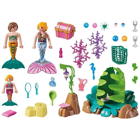 A kislányoknak egészen biztos, hogy elnyeri a tetszését ez a hatalma korall szikla, ami remek pihenőhelyként szolgál a víz alatti sellő népségnek. A csomagban három sellő figura és számtalan kiegészítő gondoskodik arról, hogy a gyerekek valóban úgy érezzék magukat, mint egy víz alatti világ részesei. A varázslatos gyöngyök, és a tengerfenéken pihenő kincsesláda igazi kalandok alapjai lehetnek. A Playmobil figurák és kiegészítők kompatibilisek egymással így a gyerekek szabadon variálhatják őket, hogy egy igazi, színes és változatos világot alkossanak meg általuk, amelyekben a legkülönösebb történeteket is el lehet játszani.