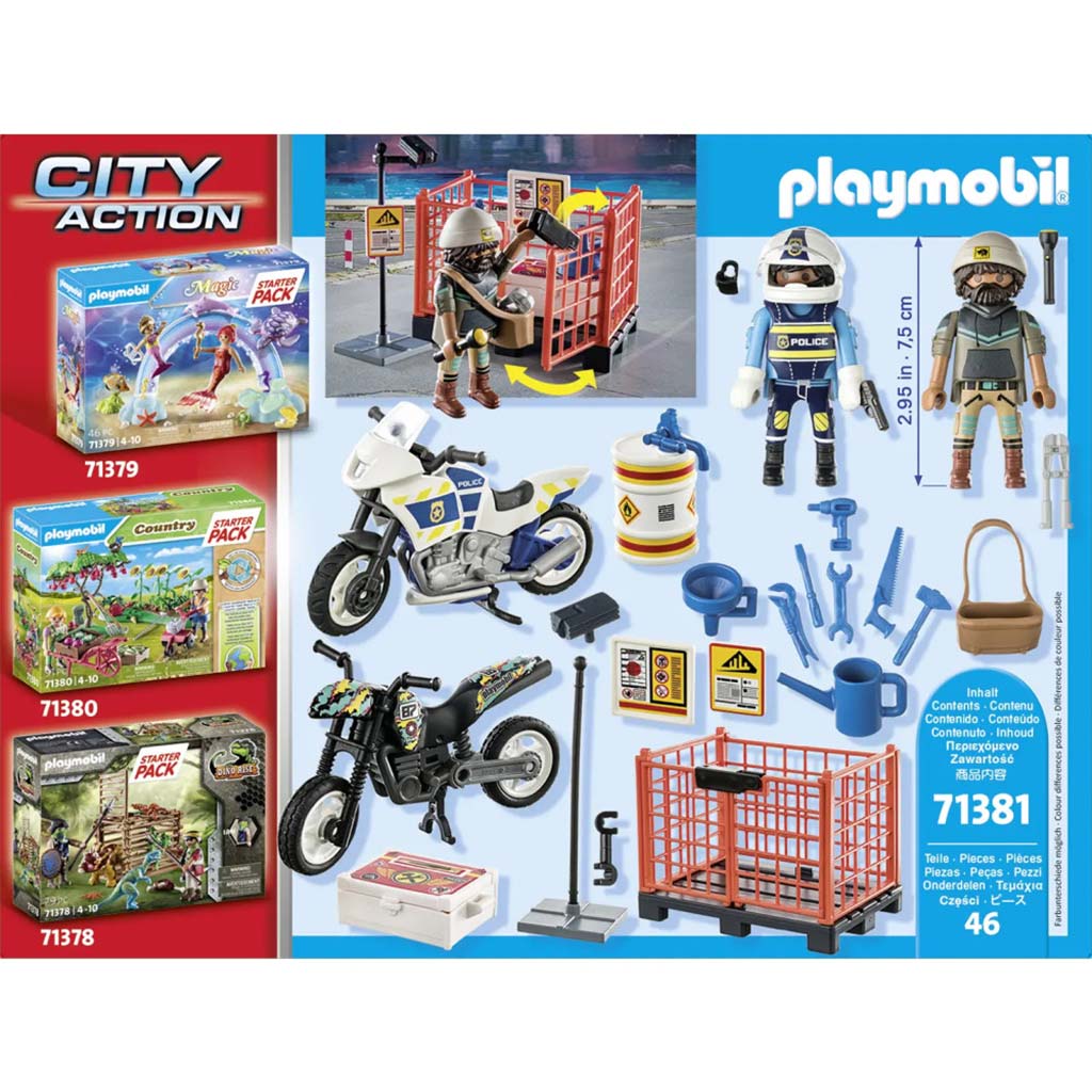 A 46 darabos Playmobil játékszett egy izgalmas rendőrségi üldözést kínál, ahol a gyerekek belemerülhetnek a rend és rendetlenség izgalmas világába. A szett két főszereplője egy rendőr és egy rabló, akik egy különleges kalandos történetben vesznek részt. A rendőr felszerelése magában foglal egy sisakot, amely biztosítja a biztonságát a veszélyes üldözés során, és egy pisztolyt, amivel megvédheti magát a bűnözőkkel szemben. A rabló rendelkezik egy táskával, amelybe az ellopott zsákmányt rejtheti, valamint egy harapófogóval és egy zseblámpával, amelyek a rablói tevékenységéhez szükséges eszközök. A szett járművei között szerepel egy rendőrségi motor és egy terepmotor, amelyek lehetővé teszik az üldözést a város utcáin és a kihívást jelentő terepeken egyaránt. A kiegészítők között található egy lámpa, egy biztonsági kamera és egy közlekedési tábla, amelyek tovább gazdagítják a játékteret és hozzáadnak a szituáció realisztikus hangulatához. Ezek az elemek segítenek a gyerekeknek élethű környezetet kialakítani, ahol a rendőr és a rabló izgalmas üldözésbe keverednek.