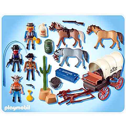 Vajon mit fuvaroznak ezzel a ponyvás lovaskocsival? A banditák is erre szeretnének választ kapni, és cselekednek is, hogy valami értékeset zsákmányoljanak. A lovaskocsi hajtói próbálnak ugyan elmenekülni előlük, de a súlytöbbletnek köszönhetően a banditák hamar utolérik őket. A vadnyugati kalandok során mindennaposak az ilyen fosztogatások, melyet most a Playmobil Western világodban Te is eljátszhatsz!