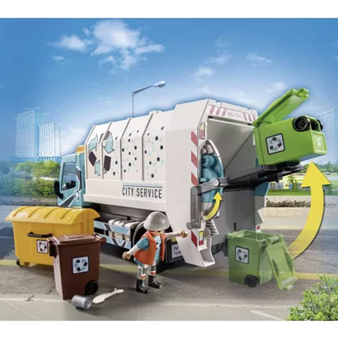 A szemétgyűjtésnél sok a tennivaló. A lakóövezetben lévő összes kukát és konténert ki kell üríteni. A sofőr óvatosan megközelíti a nagy szemeteskocsival a kukákat, a kollégája a teli kukát a tartóba helyezi, és kinyitja a fedelét. Meghúzza a kart, aminek hatására a kuka felemelkedik, és a szemetes tartalma a teherautó tartályába hullik. A nap végén a szemeteskocsi a szemétdombon üríti ki a tartályát. A játékkészlet két Playmobil figurát, egy villogó fényekkel és levehető tetővel ellátott kukásautót, két kukát, egy szemetes konténert és egyéb kiegészítőket tartalmaz. A szemeteskocsi kiürítéséhez a tartály billenthető, aminek következtében a hátulja automatikusan kinyílik, így az összegyűjtött szemét egyszerűen kiüríthető. A Playmobil figurák és kiegészítők kompatibilisek egymással így a gyerekek szabadon variálhatják őket, hogy egy igazi, színes és változatos világot alkossanak meg általuk, amelyekben a legkülönösebb történeteket is el lehet játszani.