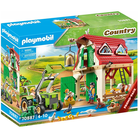 A gazdálkodó család napja kora reggel kezdődik. Mindenki segít az állatok és a farm gondozásában. Először az istállóba megyünk, ahol a tehén és a borjú már friss takarmányra vár. Természetesen a birkáknak is jut széna, majd az istállót kitakarítják. Az egereknek ez túl nagy nyüzsgés, és gyorsan egy szalmazsák mögé bújnak. Odakint a libák és a csibék már kaparásznak, és várják az ízletes gabonát. Délután a gazda felesége a traktorral kimegy a mezőre, hogy összeszedje a szénát. Visszatérve az istállóba, leereszti a rakodólapátot, és óvatosan ledobja a szénabálát a teherliftre. A gazda már mindent előkészített, kinyitotta a szénapadlás kapuit, és most felhúzza a szénabálát. Este a traktort a pajtába hajtják, ahol a következő használatig biztonságosan leparkolják. A Playmobil figurák és kiegészítők kompatibilisek egymással így a gyerekek szabadon variálhatják őket, hogy egy igazi, színes és változatos világot alkossanak meg általuk, amelyekben a legkülönösebb történeteket is el lehet játszani.